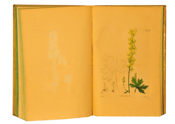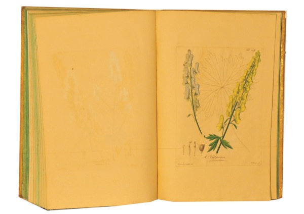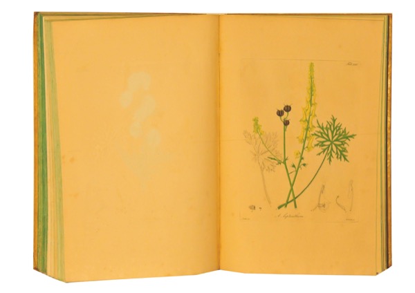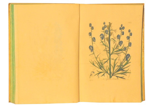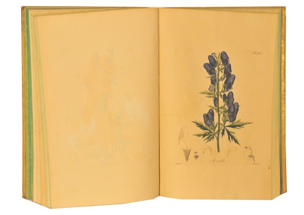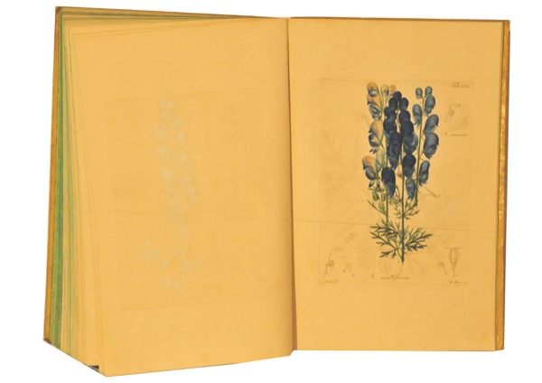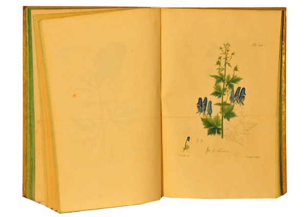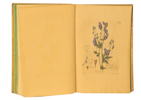 Neue Bearbeitung der Arten der Gattung Aconitum und einiger Delphinien. Mit LXXII illum. Kupfertafeln. (Sehr seltene Erstausgabe dieser Sammlung der 72 Arten des Eisenhuts mit 71 von Hand teilkolorierten Kupfertafeln und 1 Lithographietafel/ dickkartonierter Einband mit rotem goldgravierten Rückenschild/ gut erhaltener Grünschnitt der Seiten) (Very rare first edition of this collection about 72 species Eisenhut - blue monkshood - with 71 in parts hand-coloured engraved plates and 1 lithographed plate/ binding in strong cardboard cover with red-gold engraved titel-label on spine/ fine green cutting edges) (Très rare première édition de cette collection des 72 espèces du Eisenhut – le monkshood bleu - avec 71 tableaux gravés et partiellement coloriés à main et 1 tableau lithographé/ réliure en carton épais avec pièce de titre au dos estampé en or et rouge/ tranches bien en vert)