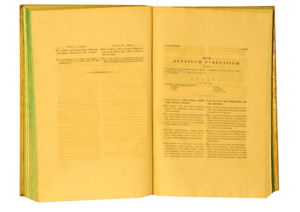Bemerkungen: Erste und einzige Ausgabe der von dem Botaniker und Zoologen Heinrich Gottlieb Reichenbach über Jahre gesammelten und nach einem eigenen philosophischen Pflanzensystem wissenschaftlich beschriebenen 72 Eisenhutarten, die er dazu dann in altkolorierte Kupfer gebracht hat. More pictures and informations available by website Antiquariat Schloss Ahlhausen. Nissen, BBI 1605. Pritzel 7499. Graesse VI, 71. Dunthorne 259. Coll. A. Plesch 637.